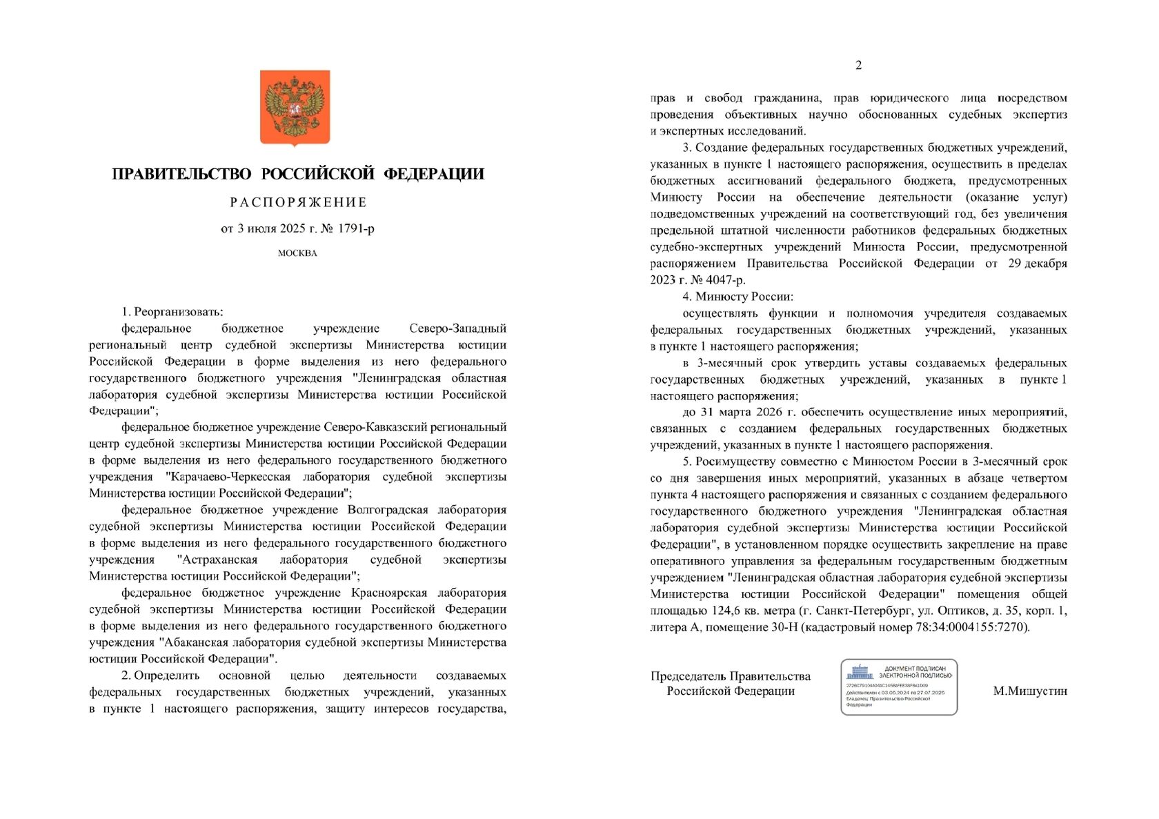 № 1791-р, подписанным председателем Правительства Российской Федерации Михаилом Мишустиным, предусмотрена реорганизация ФБУ Волгоградской ЛСЭ Минюста России в форме выделения из него Астраханского филиала в федеральное государственное бюджетное учреждение «Астраханская лаборатория судебной экспертизы Министерства юстиции Российской Федерации» (далее – ФГБУ «Астраханская ЛСЭ Минюста России»).